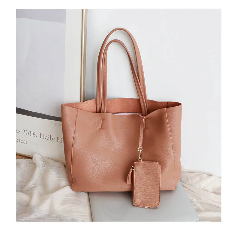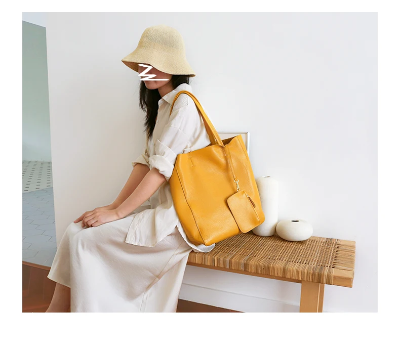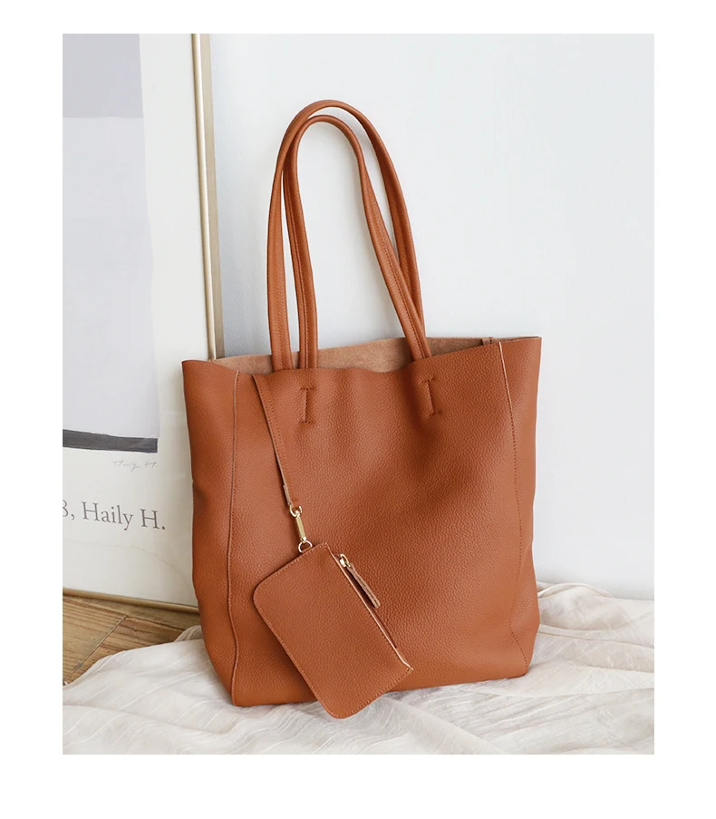 Genuine Leather Women Large Tote Bag with a Detachable Large Inner Zipper Composite Bag and Small Purse